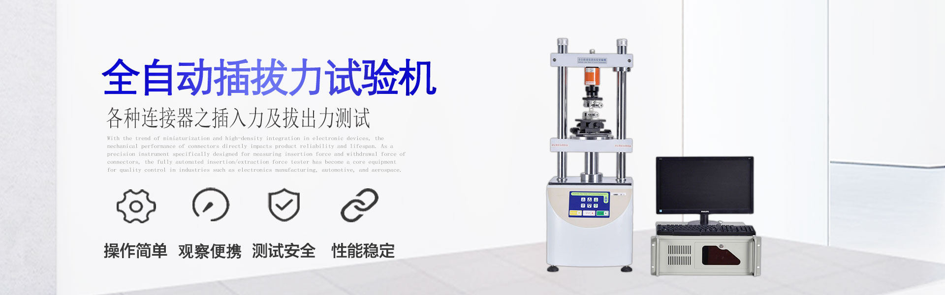 一.產品說明:本機器適用于各種連接器等產品之插入力及拔出力測試,提供各種連接器專用夾治具及搭配專利設計之自動求心裝置,將...